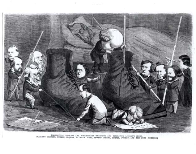 Republicans looked on the 1864 elections with foreboding. A drawn-out war that seemed never to end, mounting casualty rates, political losses due to Republican emancipation policy and war measures, and public doubts about Lincoln's leadership haunted the party. Lincoln survived party intrigues to remove him from the presidential ticket in 1864, and Republicans recast themselves as the National Union Party, and nominated Tennessee Democrat Andrew Johnson as vice president, to court a broad "Union" constituency. When the Democrats named General George McClellan as their candidate and ran him on a supposed "peace platform," Republicans had their cue. While the Democrats beat up Republicans on the issues of civil liberties and race, the Republicans charged the Democrats with selling out to the Confederacy and the giving up on the brave Union soldiers. Getting out the soldier vote proved crucial to Republican success. So, too, did timely victories in the field, especially Sherman taking Atlanta. But the Republican triumph at the polls and the Union one on the battlefield ended in gloom as Lincoln was assassinated soon after his inauguration and what to do about reconstructing the defeated South remained unanswered at his death. THE DEMOCRATIC ATTACK The Democrats charged that Republicans had plunged the nation into an unwinnable war and suppressed the civil liberties of their political opponents. The Democrats' indictment included the Republican policy of emancipation as revolutionary and unconstitutional and degrading of white labor; a ruinous financial policy based on unsound paper money, and the sale of bonds that made the rich richer at the expense of the common man. Democrats warned that continued Republican rule meant continuous war, the degradation of the white race, financial ruin, oppressive taxation, and political tyranny. REPUBLICAN SUPPORT GROUPS As defenders of the Union, the Republican cause was advanced by a variety of support organizations, many of them popular front extensions of the Party. The Union League movement, private Republican clubs to support the war and Republican electoral efforts, began in Illinois in the spring of 1862 and spread rapidly through the North - organized in Philadelphia later that year. Similar was the Loyal National League, which sought to be a wider-based organization than the Union League clubs. The Loyal Publication Society published pro-Union pamphlets for national distribution. Women were deeply involved both as individuals and in groups, such as popular writer Gail Hamilton, and the Ladies Union Aid Society of St. Louis, publishers of Charles C. Drake's Union and Antislavery Speeches. And, in 1864, Jewish groups in Indiana, New York, and Pennsylvania formed the Jewish Union Republican Association. THE UNION LABEL Republicans as champions for the restoration of the Union rode on a wave of patriotic sentiment manifest even in a variety of commercial products and services, such as these Union collars and cuffs produced by the Lockwood Manufacturing Company - see the advertisement above. The assimilation of Unionism into the marketplace helped assure Republican victory. |
