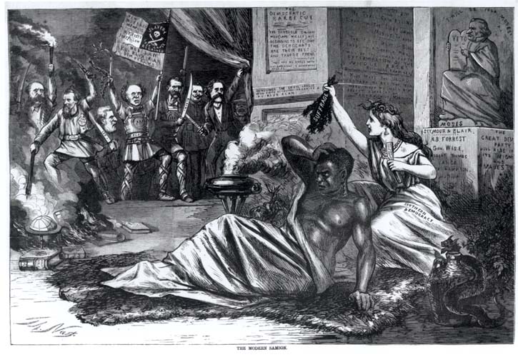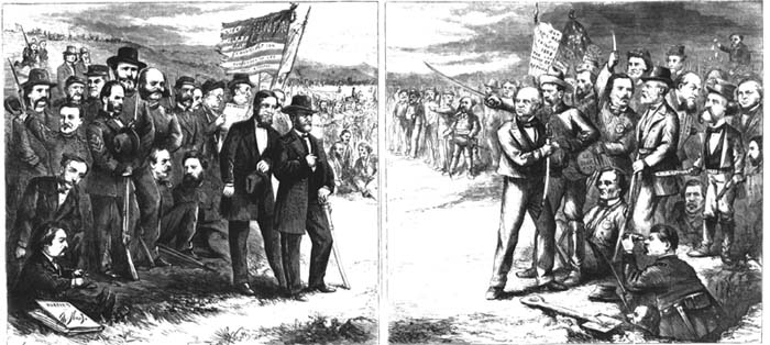 In 1868 the Republican nomination of General Ulysses S. Grant was a foregone conclusion. Stung by a string of defeats in northern state elections in 1867, amid charges of Republicans' corruption and too cozy regard for black rights, the Republicans turned to the hero of Appomattox and ran on his record of Union victory and personal honesty and modesty. Republicans largely conducted a campaign of image over ideas. They appealed to voters tired of posturing politicians and eager to bring order to the South and good government to the nation by trading on Grant's war record, Lincoln's memory, and the promise of efficient and responsible government. Republican platform calls for equal suffrage, justice to blacks, and support for immigration got short shrift as Republicans discovered they could get more votes tarring Democrats as disloyal and despicable and echoing Grant's plea, "Let us have peace." Grant won the electoral vote handily, but did less well in the popular vote. Indeed, without black votes in key states, the Republicans would have lost. That fact moved Republicans heretofore reluctant to enfranchise blacks nationally to endorse a 15th Amendment to do just that. "Both Sides of the Question. The Boys in Blue. The Boys in Gray." Harper's Weekly, October 24, 1868.