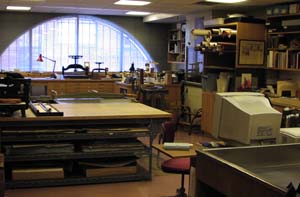 The conservation department is responsible for collection maintenance, including conserving individual items; selecting appropriate housing materials and creating custom storage for books and other items; establishing guidelines and monitoring the temperature and humidity levels in our building; writing and updating a disaster plan; exhibition preparation such as matting, framing and making custom book supports; preparing materials for loan to other institutions.