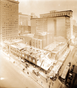 Our image shows the demolition of the Forrest Theatre on South Broad Street between Sansom and Walnut Streets. Built between 1905 and 1907, the Forrest Theatre served as Philadelphia’s leading venue for musical comedy until its destruction in 1927. The following year, a new Forrest Theatre opened at 11th and Walnut Streets. The Fidelity Building, now known as the Wachovia Building, rose on the South Broad Street site. The William Jennings Photograph Collection includes thirty one photographs documenting this site from the demolition of the Forrest Theatre in March 1927 through the completion of the Fidelity Building’s exterior in the spring of 1928.