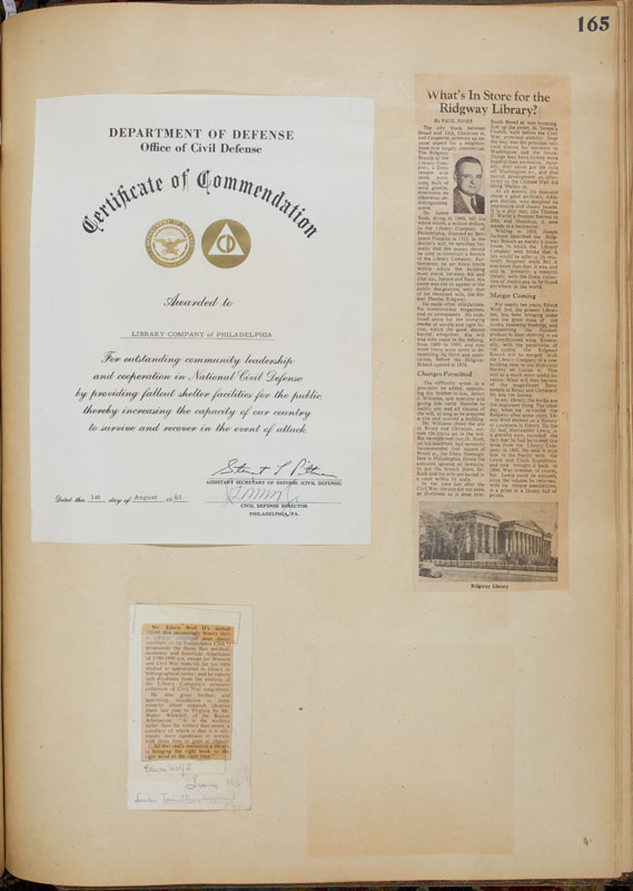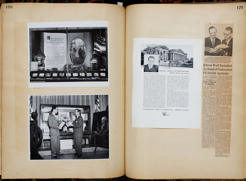 Louise Beardwood, one of the Library Company’s longtime volunteers, recently completed an inventory of a scrapbook documenting part of the Library Company’s past. The scrapbook provides a fascinating glimpse into our mid-20th-century history, a time when the Library Company struggled to establish a vision for the future which finally culminated in our re-invention as a research library. The impressively-sized scrapbook (weighing in at more than twenty pounds!) covers the activities of the Library Company from roughly 1936 through 1966. Several hands compiled the scrapbook over a period of time, resulting in some material being clearly identified while other material is not.