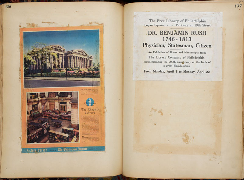 Most of the items pasted on the more than 160 pages of the scrapbook are clippings from area newspapers. Much of the activity at our Juniper and Locust Street building involved the Women’s Committee, and news coverage of those events includes comments on the attendees and what they wore, interviews with the speakers, and general descriptions of the material in the related exhibitions. Other newspaper clippings include reviews of exhibitions, comments on specific holdings, many re-tellings of the history of the Library Company, notes regarding our various buildings, and occasional financial news.