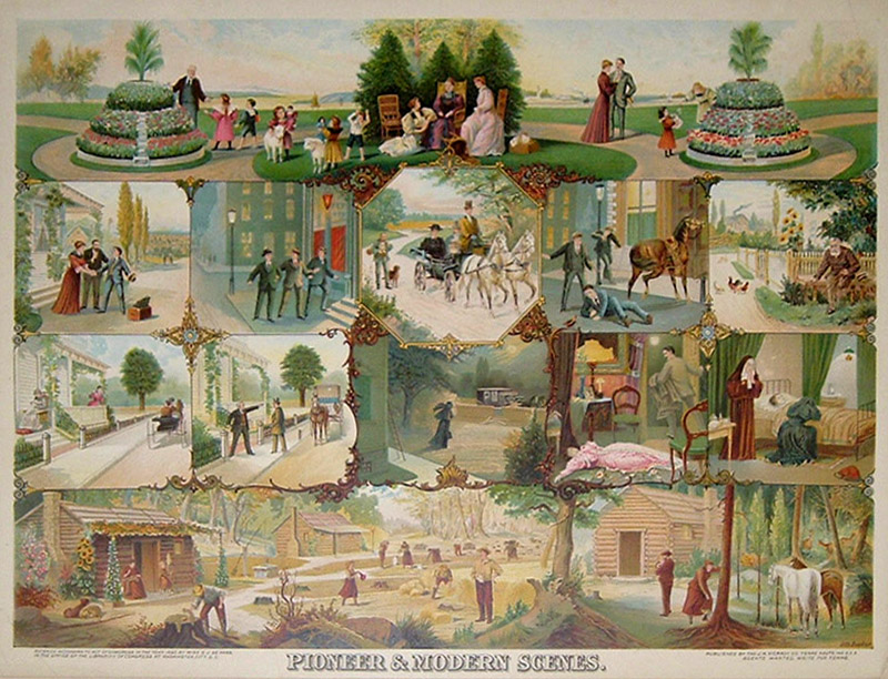 Becker, F. Otto. Pioneer & Modern Scenes. (Terre Haute, Indiana: Published by the J. M. Vickroy Co., 1895), chromolithograph.
