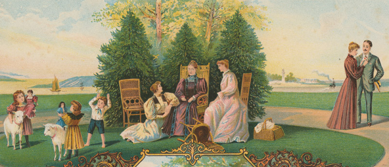 The chromolithograph, published by J. M Vickroy & Co., a mid-west firm that specialized in genealogical and fraternal order certificates, contains two illustrated morality tales bordered by idyllic scenes of pioneer and modern life. German-born artist F. Otto Becker, best known for the 1895 lithograph “Custer’s Last Stand,” designed this retrospective montage of views. Heavy-handed and oblique visual cues abound in the scenes to forewarn the print holder about the slippery slope that is modern life, especially the spirit of self-indulgence criticized in the previous decades known as the Gilded Age.