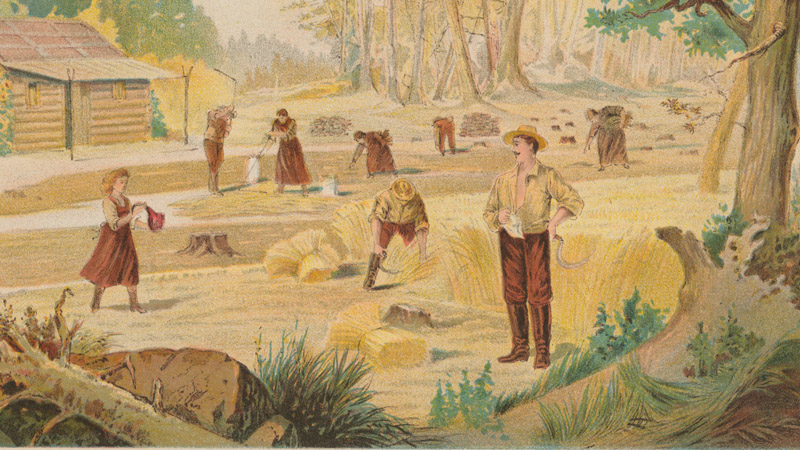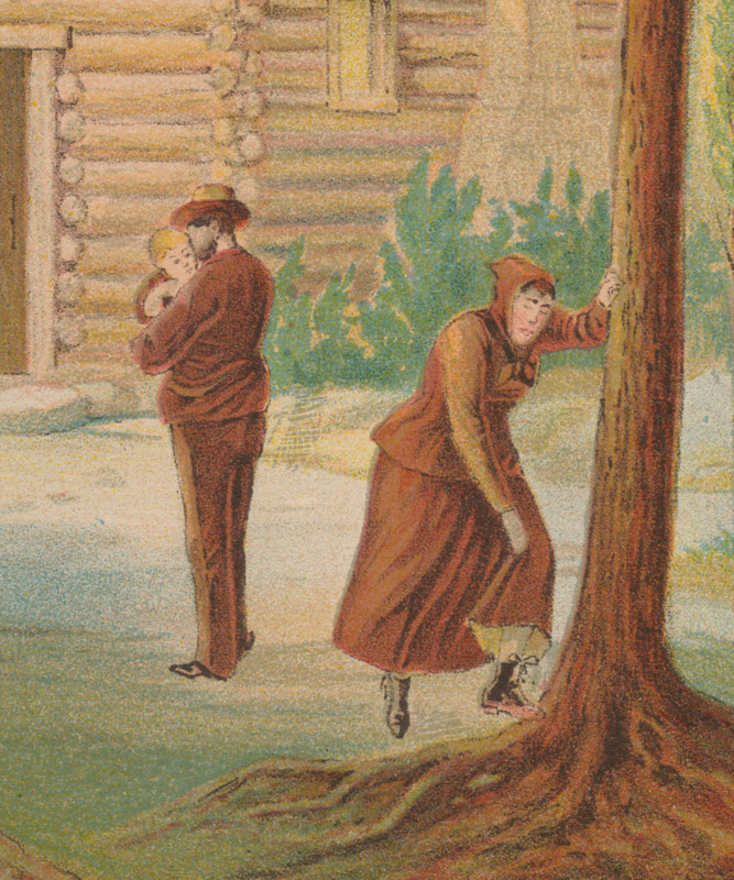 This multi-faceted print engages the viewer on several levels in its depiction of the competing values of a society in transition. The chromolithograph challenges our expectations of late-19th-century perceptions of pioneer life while at the same time it reiterates the gender stereotypes associated with Victorian society.