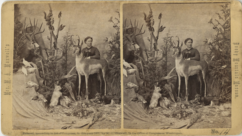 As a child in rural north central Pennsylvania, Martha learned a love of nature from her grandmother. The family moved west to Wisconsin, and later Martha continued her westward journey into Colorado after her 1854 marriage to James Maxwell. While in Colorado, she wrote to family members requesting a book that would help her “to learn how to preserve birds & other animal curiosities in this country.” During an extended stay in Wisconsin in the mid-1860s, Maxwell studied taxidermy and upon her return to Colorado focused her attention on building a collection of native birds and mammals. Maxwell used plaster molds and later iron frames over which to stretch the skins, rather than sewing the skins together and stuffing them, as most other taxidermists did. In mid-1874, she opened her Rocky Mountain Museum in Boulder, Colorado to display her specimens for both education and entertainment. Hoping to find more support in a larger city, Maxwell moved her museum to Denver a little more than a year later.