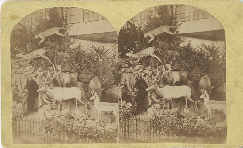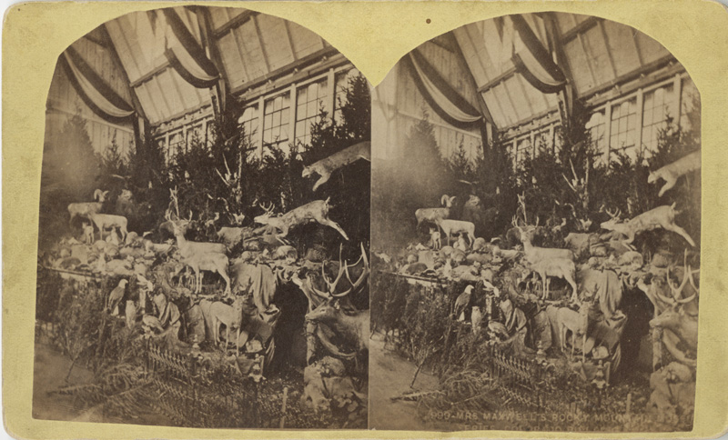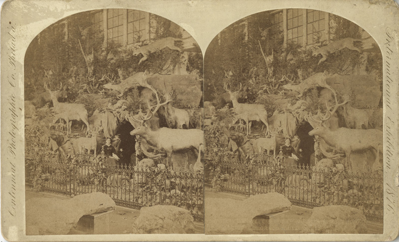 Even among the seemingly endless rarities and exotic delights from around the world, Martha Maxwell’s exhibit at Philadelphia’s Centennial Exposition in 1876 created quite a stir. Displayed in the Kansas-Colorado Building rather than the Women’s Pavilion, Mrs. Maxwell’s Rocky Mountain display fascinated both visitors and the press. Using “paste, pulverized ore, water, lime, gravel and evergreens” as her construction materials, Maxwell built a realistic natural landscape in which to place wildlife specimens. Maxwell herself had killed many of the specimens and all had been transformed by her considerable taxidermy skills. Library Company Trustee Lisa Baskin donated several stereographs of Mrs. Maxwell’s display this year and we purchased another stereograph from a local dealer.