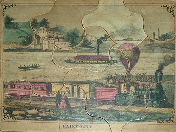 The puzzle, composed of a hand-colored lithograph pasted on a wood board that was then cut by a jig saw, depicts a day of leisure at the park. Important landmarks fill the scene. A couple waits to board a car of the Reading & Columbia Railroad, the Philadelphia railway completed in 1834. A barge and a row boat transport passengers past the Wire Suspension Bridge in Fairmount, the first suspension bridge in the United States, spanning the Schuylkill River since 1842. A hot air balloon makes its ascent from the banks of the river. A group of cheering children and their adult chaperones gather together and watch this nineteenth-century form of entertainment. Across from the frivolity, the Fairmount Water Works is visible. This tourist attraction and water processing facility, built in 1812-1822 after the designs of Philadelphia engineer Frederick Graff, stands in the distance, not yet altered with a new mill house built 1859-1862.