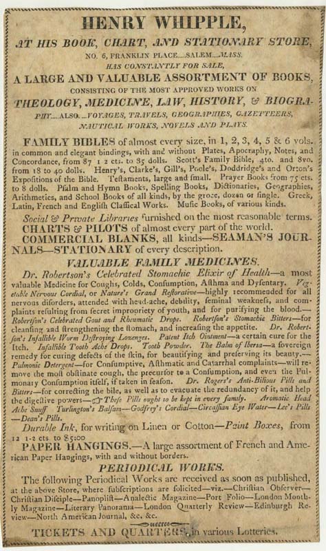 Henry Whipple, at His Book, Chart, and Stationary [sic] Store, No. 6 Franklin Place … Salem … Mass. Has Constantly for Sale a Large and Valuable Assortment of Books … (Salem?, ca. 1810-1820). Henry Whipple’s shop in Salem, Massachusetts, had something for everyone. Here one could find family bibles from 87-1/2 cents to 40 dollars, school books, and issues of the most popular periodicals. Standard bookstore fare found at Whipple’s included stationery, ink, blank books, blank forms, and paper hangings. The largest portion of text in Whipple’s ad, though, was dedicated to hawking the shop’s assortment of “valuable family medicines,” including Dr. Robertson’s Infallible Worm Destroying Lozenges, Godfrey’s Cordial, Circassian Eye Water, and the Balm of Iberia. The Library Company’s ardent interests in early American printing and publishing, patent medicine, and economic history are all referenced in this one small (21 cm.) broadside. $150