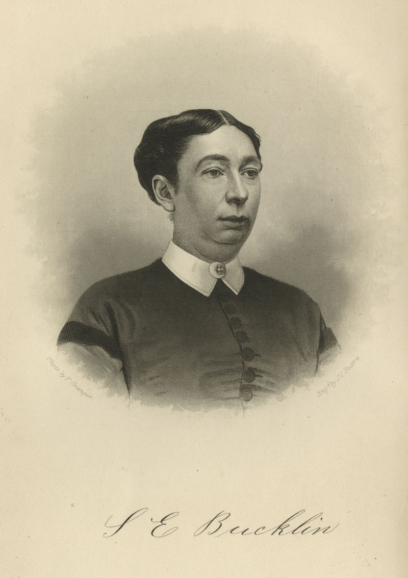 Sophronia E. Bucklin. In Hospital and Camp (Philadelphia: John E. Potter, 1869). Bucklin, an Army nurse on the front line during the Civil War, was known for her assertiveness in challenging surgeons’ opinions. Her memoir’s subtitle “a woman’s record of thrilling incidents among the wounded in the late war” suggests that the publisher may have tacked on a sensational title to boost sales. The book’s twenty-one plates include this portrait frontispiece of the author. Sponsored by Kerry L. Bryan |