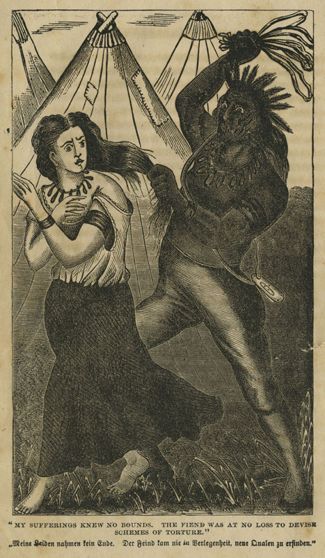 The True Narrative of the Five Years’ Suffering & Perilous Adventures, by Miss Barber ... A Valuable Feature of This Work Is the Indian Receipts (Philadelphia: Barclay & Co., 1873?). Woman in peril! Stories about Indian captivities were page-turners for 18th- and 19th-century Americans. This fictional account of the experiences of “Mary Barber” suggests that she survived and returned “East” with valuable Indian remedies. For example, one learns that a tea made from equal parts of Wee-ne-oh (mandrake), See-tu-bar (spearmint), and Wanc-to-o (cream of tartar) would be effective in treating diseases of the liver, dyspepsia, obstructed menses, dropsy, venereal diseases, and other ailments. Note, too, the bilingual captions on this illustration. One suspects that Barclay & Co. also issued a German-language edition of this action-packed story with its appendix of home remedies. $100 |