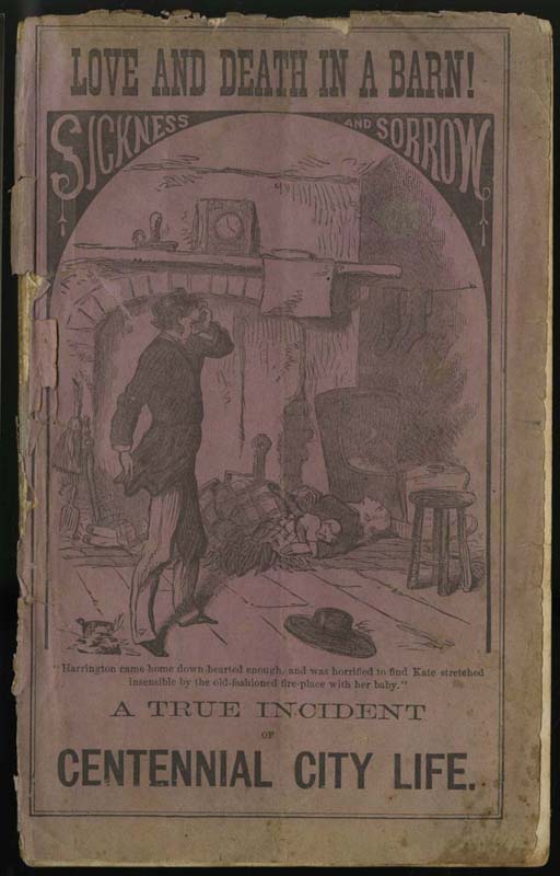 Sweetness and Sorrow in Centennial Philadelphia Love and Death in a Barn; or, the Sad, Sorrowful Life of Beautiful Kate Harrington … (Philadelphia, 1876). The Stranger’s Illustrated Pocket Guide to Philadelphia … (Philadelphia, 1876). In 1876, America celebrated its 100th birthday and the biggest party was in Philadelphia, at the Centennial Exhibition. Many publications were produced as part of the Centennial to welcome visitors to the city and help them make their way through the exhibition and the surrounding metropolis. The heavily illustrated Stranger’s Guide highlighted the best of the city (i.e., the Library Company) and featured a healthy selection of advertisements for the finest wares to be had in Philadelphia, including Whitman’s confections. But not all was sweet in the city in 1876. Love and Death in a Barn tells the tragic tale of lovers from different castes who defied convention and the wishes of family, married, and then lived in such poverty that Kate at last died of starvation, after imparting a final kiss on her baby boy. Several full-page illustrations depict the heartbreaking scene, including one on the purple paper front wrapper, where the enclosed story is described as “a true incident of Centennial city life.” This volume also contains the moving story of Mary Morton, who died in agony after a visit to a “doctor friend” of her lover, while staying in the Philadelphia boarding house of Madam Learge, who, herself, later committed suicide. Sponsored by Joseph Lippincott |