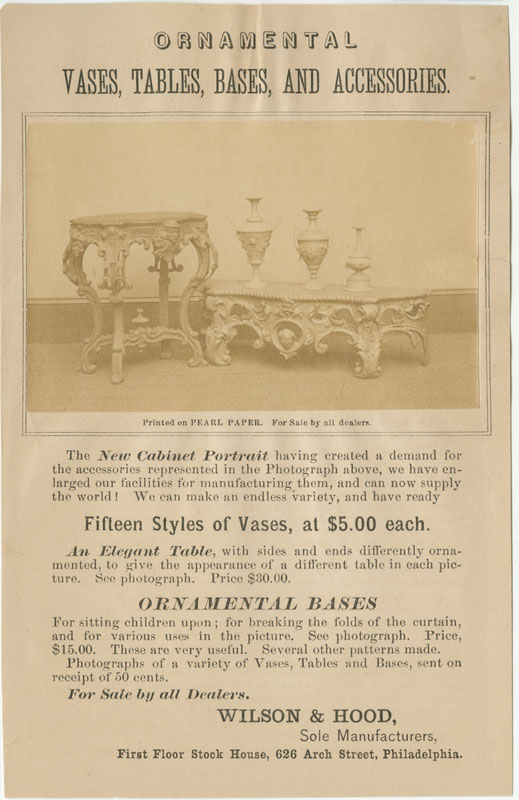 Ornamental Vases, Tables, Bases, and Accessories sold by Wilson & Hood. Philadelphia, ca. 1868. Trade card with albumen photograph. Edward L. Wilson and John G. Hood opened a photographic supply house in Philadelphia in 1866. On this trade card, Wilson & Hood informed the public that they manufactured and sold "an endless variety" of photographic props particularly suited for use in the recently introduced cabinet card photographic format. $275 |