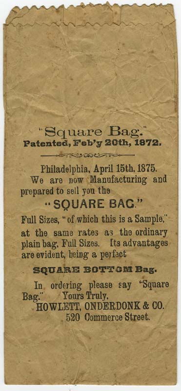 Howlett, Onderdonk & Co. "Square Bag." Patented, Feb'y 20th, 1872. Philadelphia, April 15th, 1875. We are now manufacturing and prepared to sell you the "Square Bag." (Philadelphia: 1875).
