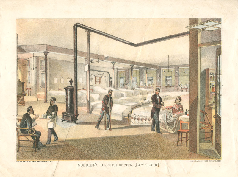 Major & Knapp Engraving, Manufacturing & Lithographic Co., Soldier's Depot, Hospital (4th Floor) (New York: Major & Knapp, 1864). Lithograph illustration published in D.T. Valentine, Manual of the Corporation of the City of New York for 1864 (New York : New York Common Council, 1864).