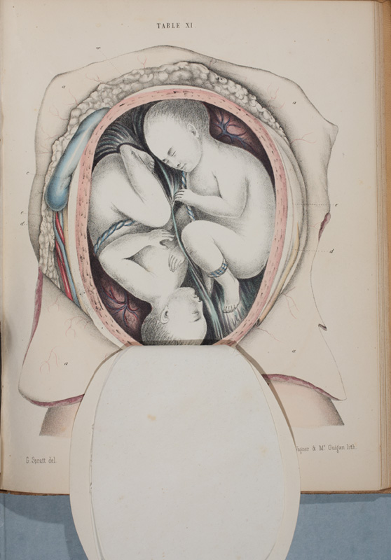 G. Spratt, Obstetric Tables (Philadelphia: James A. Bill, 1850). Hand-colored lithographed illustration showing twin fetuses.