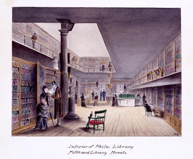 Benjamin Ridgway Evans, Interior of Phila. Library, Fifth and Library Streets, 1878. (Philadelphia, 1878). Watercolor.