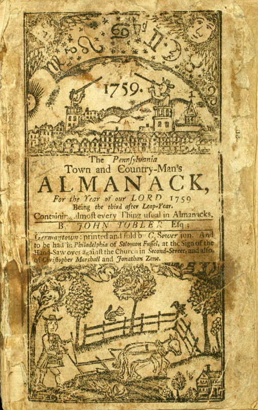The Pennsylvania Town and Country-Man's Almanack, for the Year of Our Lord 1759 (Germantown: C. Sower, jun., 1758). Illustrated title page.