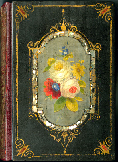 The Ladies' Scrap-book: A New Year and Christmas Gift (New York: Leavitt & Allen, 379 Broadway, ca. 1858). Papier-mâché boards with hand-painted floral design surrounded by inlaid mother-of-pearl.