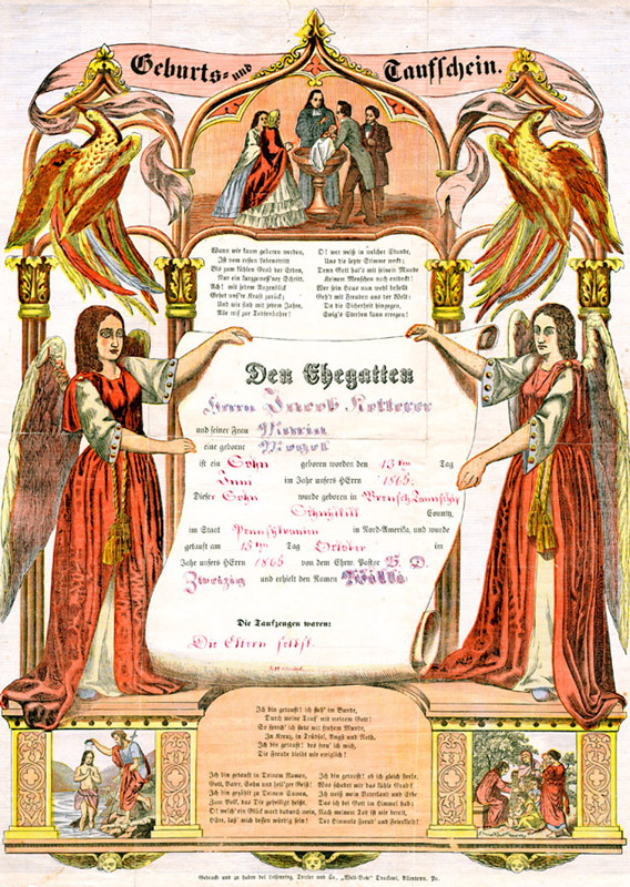 Geburts und Taufschein [Baptism certificate] (Allentown, Pa.: Leisenring, Trexler and Company, ca. 1865) Color wood engraving.