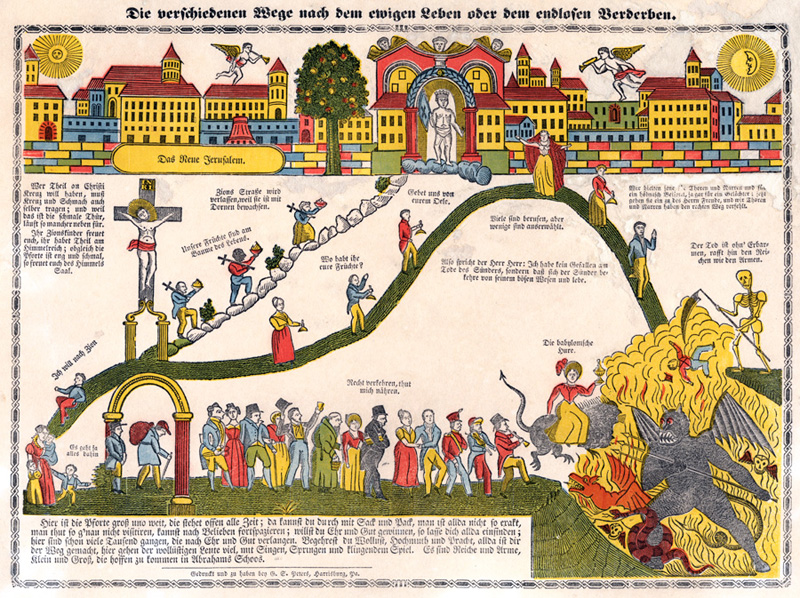 Die Verschiedenen Wege Nach dem Ewigen Leben oder dem Endlosen Verderben (Harrisburg: G.S. Peters, ca. 1835?). Color woodcut.