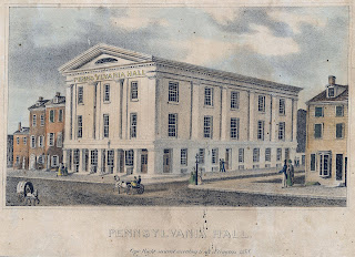 As noted in a previous post, this year marks the 175th anniversary of the dedication of Pennsylvania Hall. Constructed as a forum for free discussion of abolitionism and other reform movements, the building was inaugurated on May 14, 1838. After four days of dedication ceremonies and conventions of numerous anti-slavery societies, Pennsylvania Hall was destroyed in a fire by a mob. The amalgamation of the races combined with the presence of women, as attendees and speakers, were supposed to have been the primary factors that enraged anti-abolition elements in the city. Angelina Grimké Weld, Lucretia Mott, and Maria Weston Chapman were among the women who spoke at the dedication ceremonies, while Sarah Mapps Douglass was in attendance as treasurer of the Anti-Slavery Convention of American Women. The Library Company holds several items that document the peril these women faced and the fortitude they displayed in continuing to attend the abolitionist meetings.