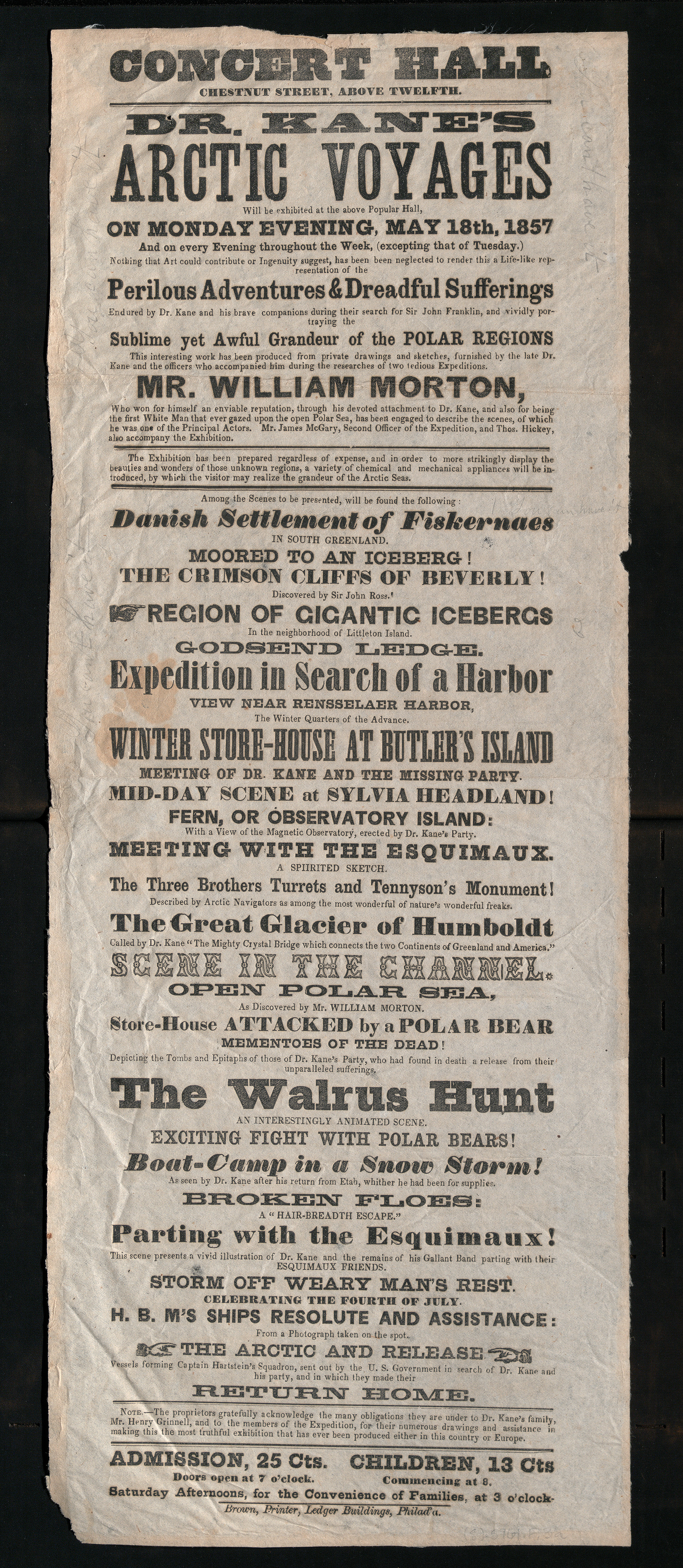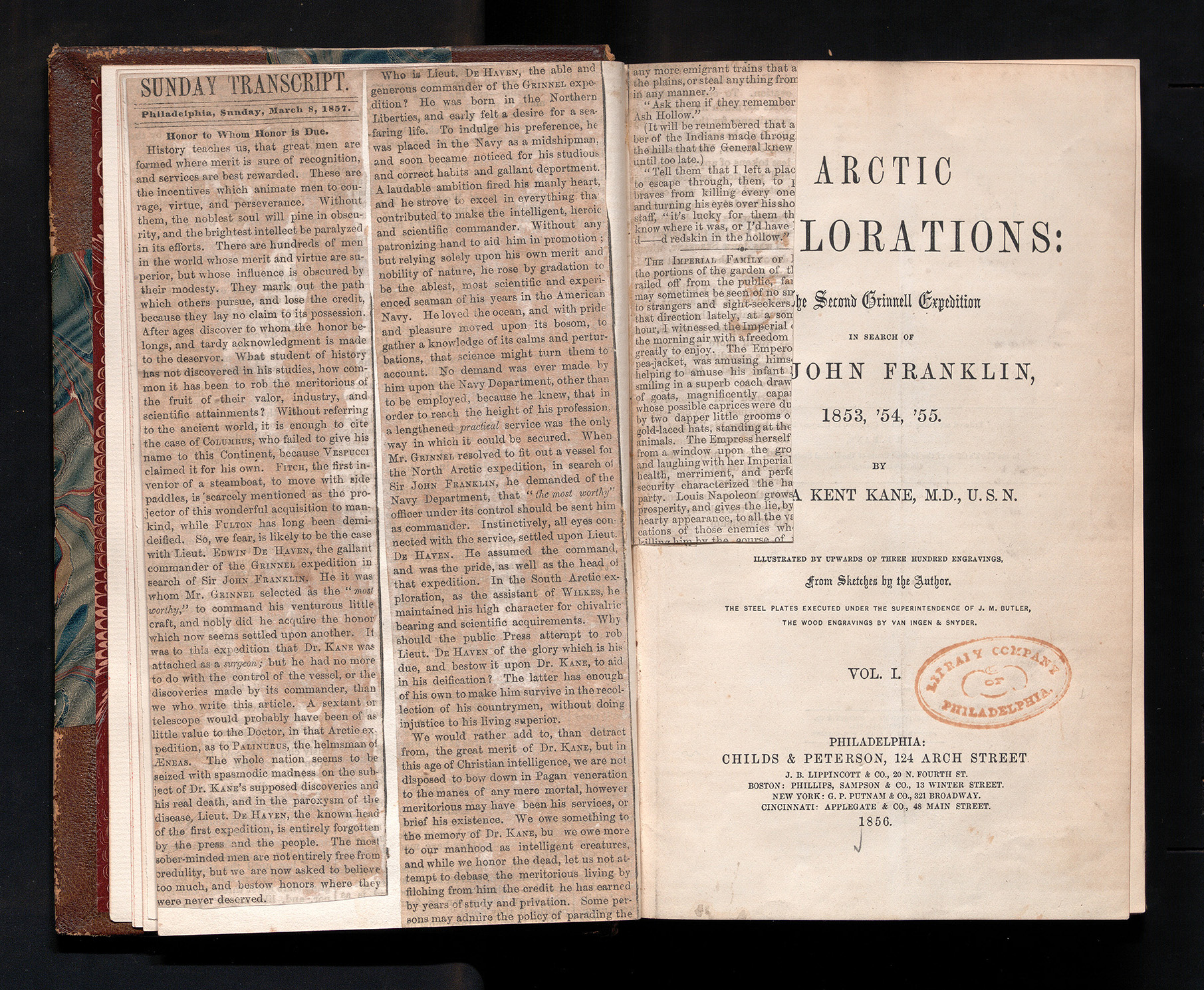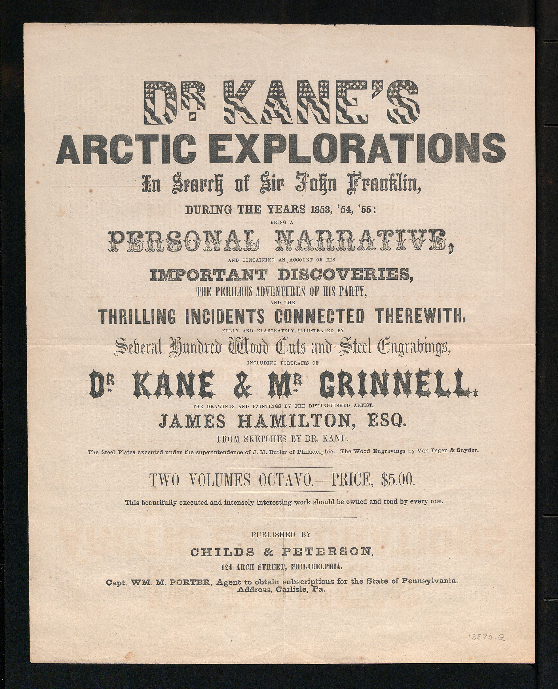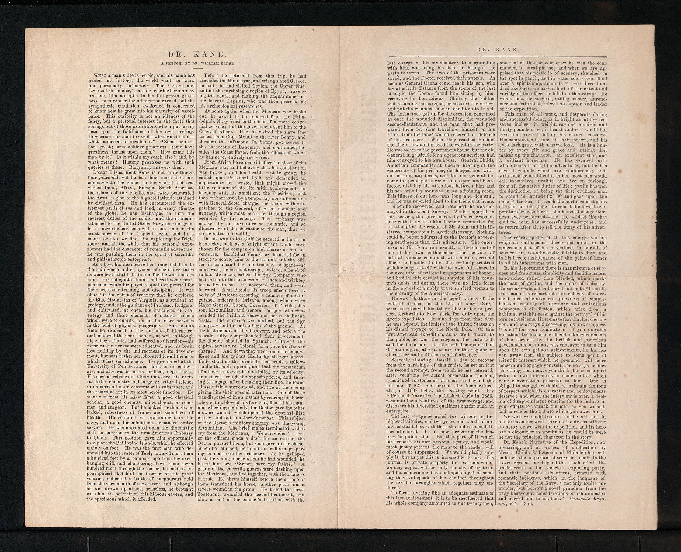 The success of the various naval expeditions, and their extensive coverage in news sources, led to the lionizing of some of their central figures. Such was the case for USN surgeon and Philadelphian Elisha Kent Kane (1820-1857). Kane was a bold adventurer, a charismatic and dynamic speaker, and dashingly handsome. He joined the first American attempt to locate and rescue the members of the lost British Franklin Expedition, and then was tapped to lead the second attempt. Both attempts at rescue failed, but Kane survived and a young nation chose him as their hero. His death just a short time later solidified his place in the American pantheon.