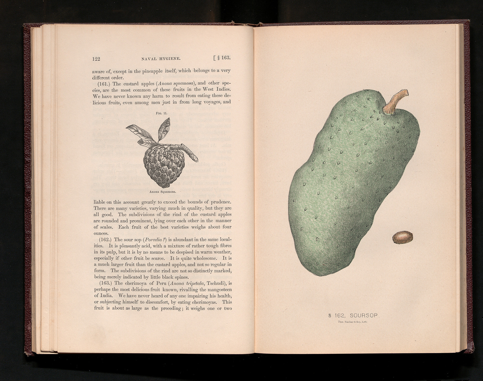 Naval medicine had to consider the challenges of extensive travel abroad, prompting some texts to offer detailed guidance on regional fruits and vegetables encountered during voyages—highlighting which were beneficial and which posed risks. One such example, shown here, is the soursop, which was noted as being particularly refreshing in warm climates.