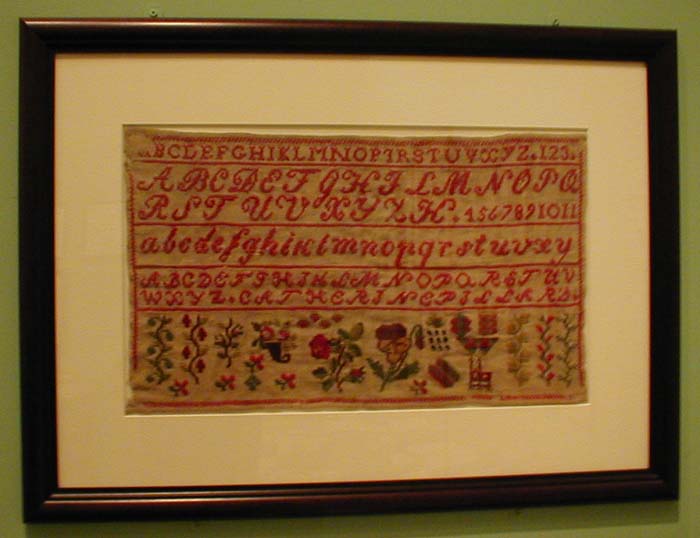 Needlework Sampler, [n.d.]. In the eighteenth and early nineteenth centuries samplers were a part of a young girl's early education that allowed her to showcase her recently acquired knowledge of both needlework and the alphabet. |