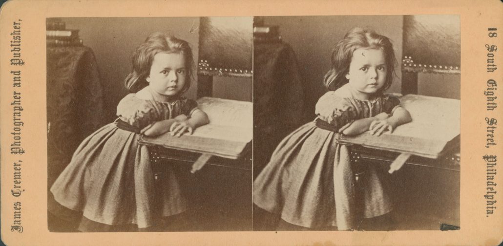 Young girl leaning on book on chair. James Cremer. Philadelphia: 1868. Stereograph. Albumen print. Gift of Jane Carson James.