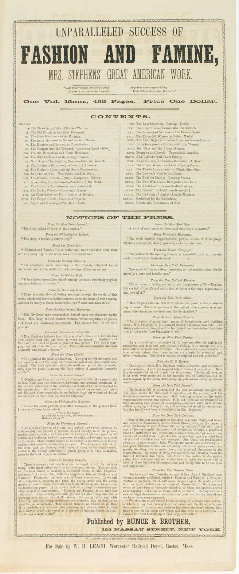 W. H. Leach. Unparalleled Success of Fashion and Famine. New York: W. H. Tinson, [1854]. (Gift of Michael Zinman)
