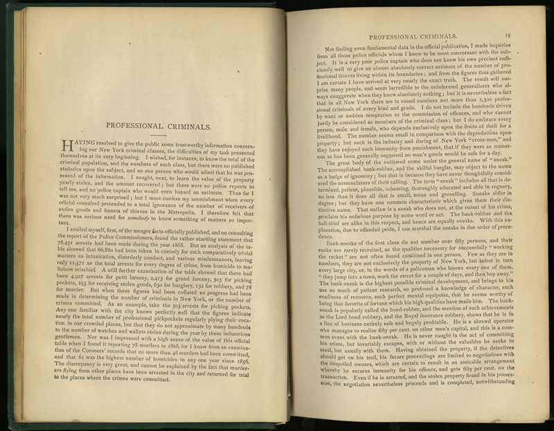 Edward Crapsey’s descriptions of professional criminals include many of the figures featured in this exhibition, from mail order fraudsters and quack doctors to gamblers, abortionists, fences, and harbor thieves. A contemporary reviewer observed that “to the thousands living in New-York whose acquaintance with the City is confined to Broadway and the up-town streets and avenues, this work will prove an astonishing revelation.” But the author knew quite well that underworld commerce was anything but a new thing.