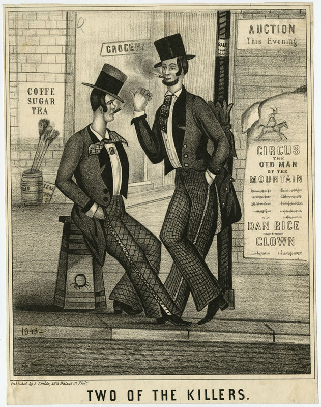 Like other cities, Philadelphia was home to many criminal gangs, including the Schuylkill Rangers and the Chockers. Here are two members of the Killers, a thieving gang that haunted the Moyamensing neighborhood; they had ties to the Moyamensing Hose Company and the Democratic Keystone Club. Reporter James McCabe said of the professional thief, “He dresses well, but flashily, and is generally plentifully supplied with money,” which is certainly true here.