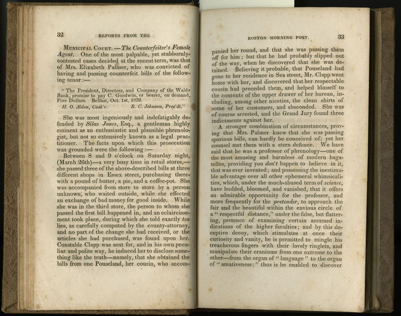 Thomas Gill, a reporter for the Boston Morning Post, compiled this volume from several years’ experience in the Boston courts. Known for their humorous tone, Gill’s accounts brought levity to the most mundane and saddest of criminal cases. Here, he describes a hearing for a woman accused of passing counterfeit notes, noting wryly that her representation is “an enthusiastic and plausible phrenologist, but not so extensively known as a legal practitioner.”