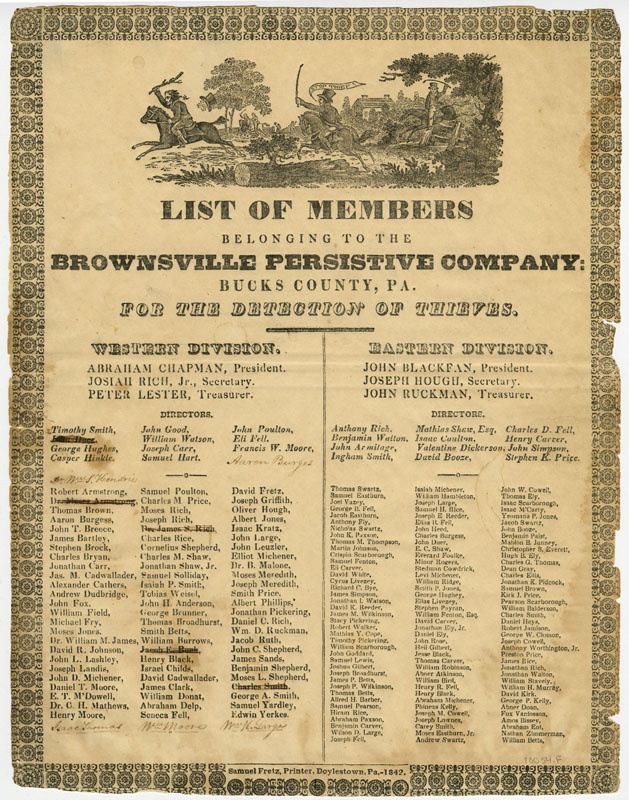 Brownsville Persistive Horse Company. List of Members. Doylestown, Pa.: Samuel Fretz, 1842.