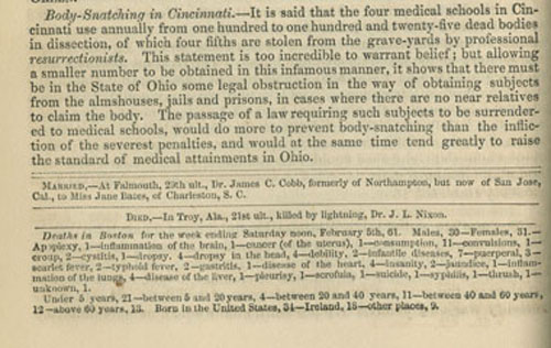 “Body-Snatching in Cincinnati,” The Boston Medical and Surgical Journal, February 10, 1859.