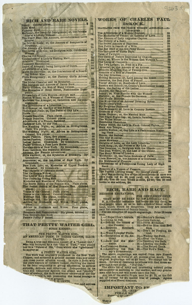 Although English common law had prohibited the sale of obscene literature since the 18th century, American officials did not begin to prosecute offenders until the 1840s. The explosion of book publishing during this time included, too, the production of “dirty” books, which were quite lucrative for publishers and sellers if they succeeded in conducting their business undetected. The Secret Habits of the Female Sex was one such publication, sold anonymously “by the booksellers generally.” Not only was it considered obscene – containing descriptions of female masturbation (ostensibly to warn mothers to protect their daughters from this solitary vice) – but it was also “fancy,” featuring several homoerotic plates. It sold for fifty cents, about half a day’s wages for a common laborer and a third of a day’s for a skilled worker at mid-century. |