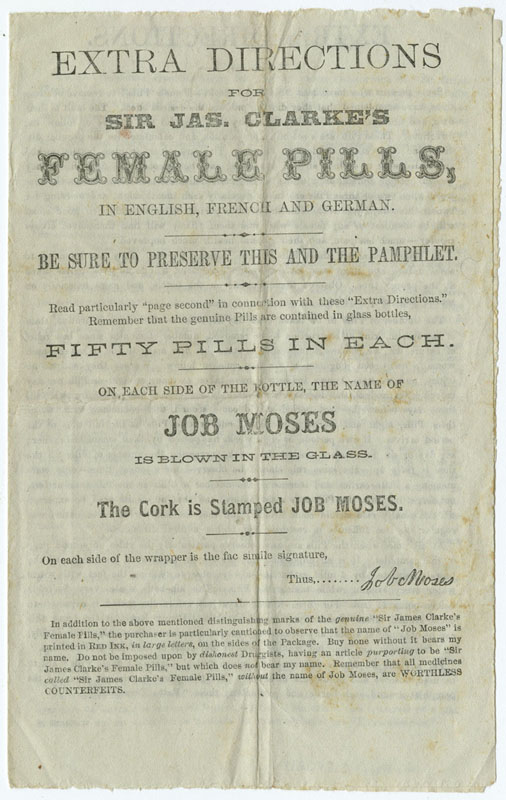 Job Moses. Extra Directions for Sir Jas. Clarke’s Female Pills. [Rochester, N.Y., ca. 1860]. (Gift of William H. Helfand) |