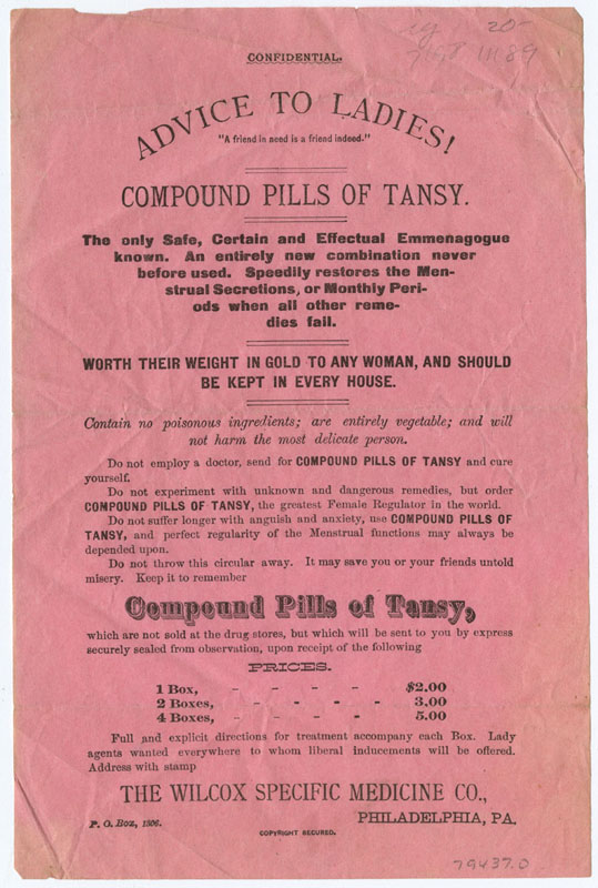 Patent medicine purveyors offered any number of pills, douches, and preparations for women who did not have access to professional abortion providers or wanted to keep their pregnancy status to themselves. Often containing tansy, pennyroyal, and other emmenagogues (to stimulate menstruation), they capitalized on effective folk remedies which could be dangerous to a woman’s health if not properly administered. |