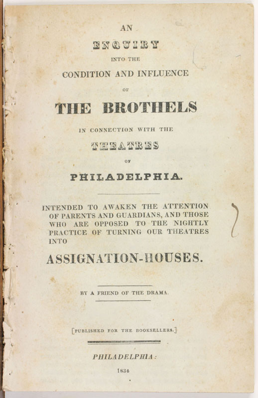 An Enquiry into the Condition and Influence of the Brothels in Connection with the Theatres of Philadelphia. Philadelphia: Published for the Booksellers, 1834. (Gift of Dr. John Bell)