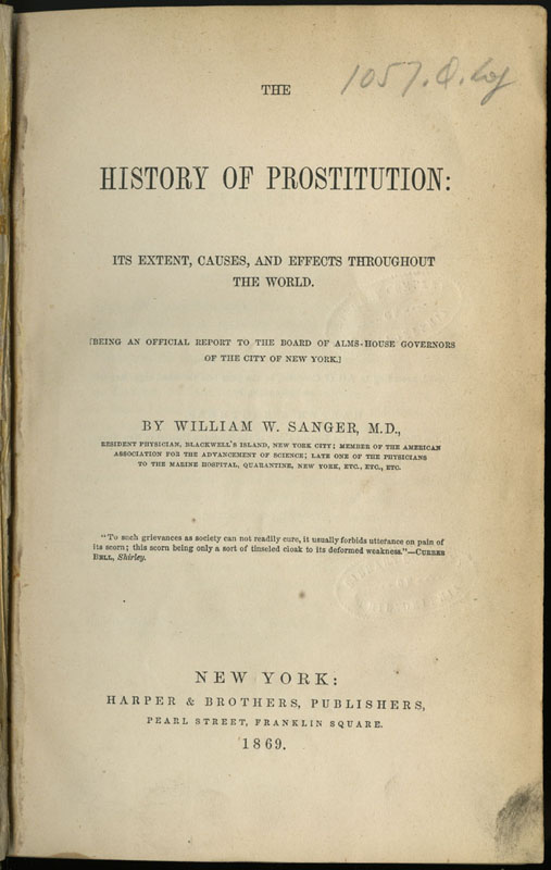 William W. Sanger. The History of Prostitution: Its Extent, Causes, and Effects throughout the World. New York: Harper & Brothers, 1869.