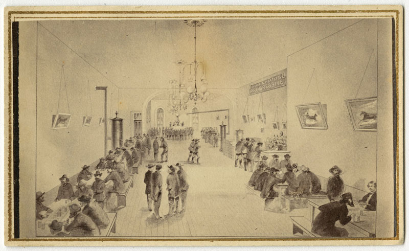 Chase & Heatley Progressive Club, Denver, Colorado. Photographic reproduction of an original drawing, 1865. (McAllister Collection) |