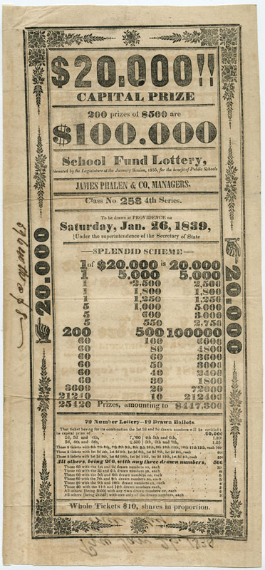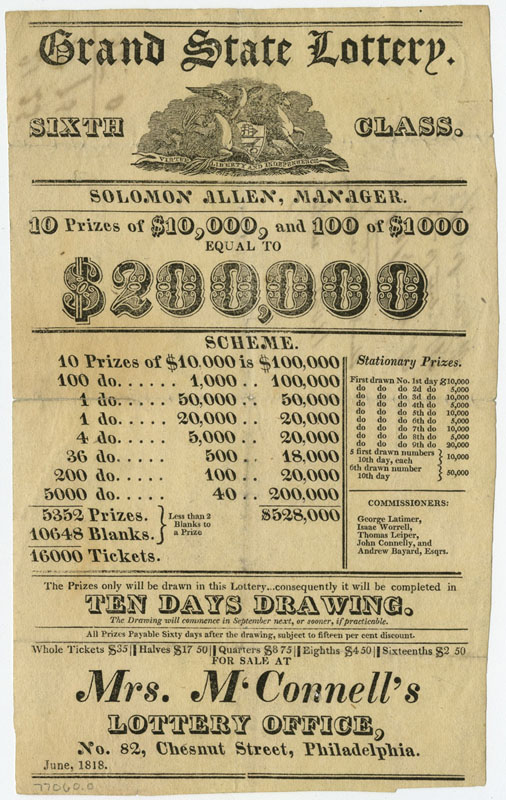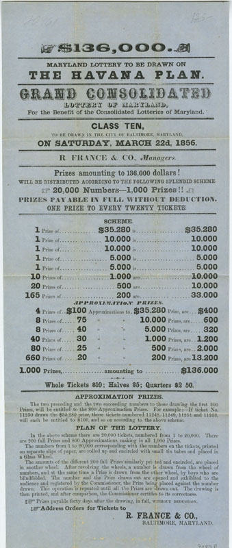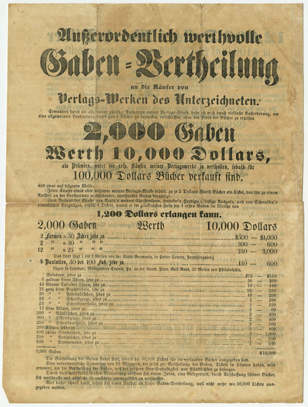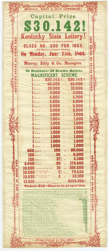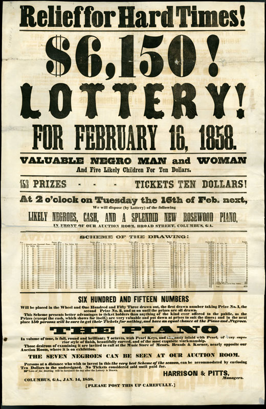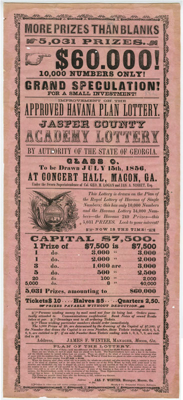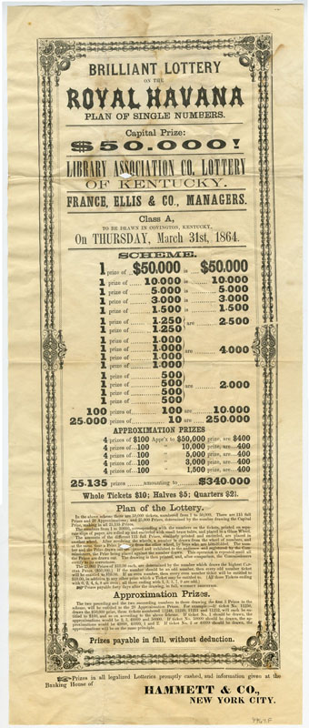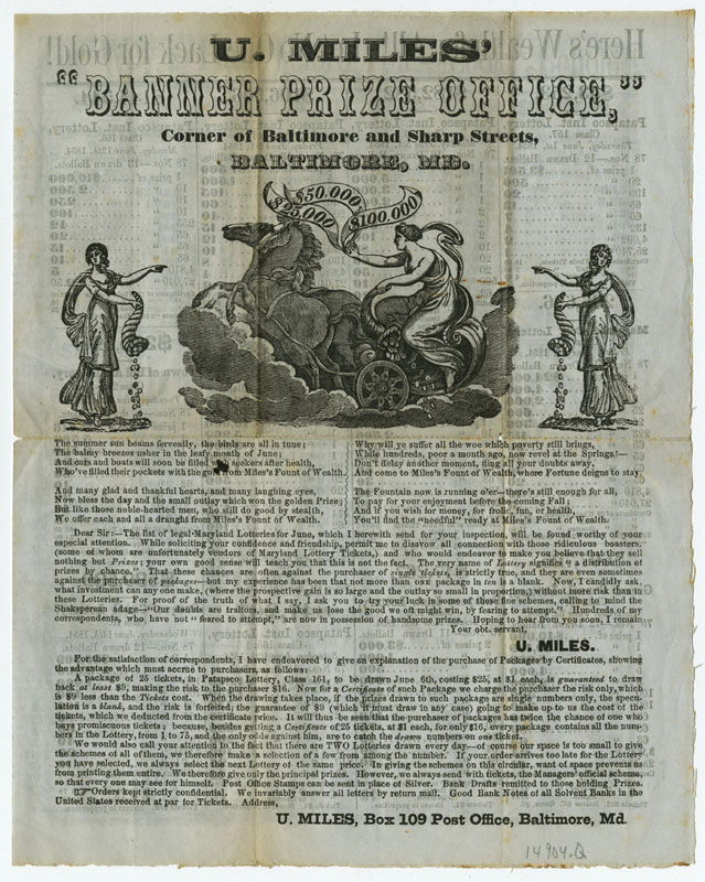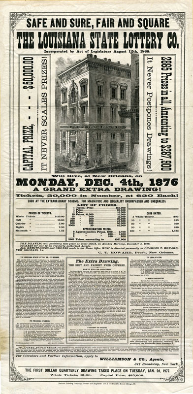 Placing BetsSince the Colonial era Americans used lotteries, rather than tax hikes, to raise money to fund important endeavors such as making internal improvements, building educational institutions, and waging wars. In the 19th century public lotteries continued in the same vein, and were joined by private lotteries organized by individuals and companies. By the 1810s the number of lotteries began to rise exponentially, making way for an entirely new profession, the lottery broker. Once sponsoring parties had been granted a franchise, the middleman-broker would oversee every aspect, including ticket sales, advertising, and payouts. Many lottery brokers would go on to stellar careers in banking, such as ticket salesman John Thompson, who founded the Chase National Bank (Chase Manhattan) in 1873. Although states began outlawing lotteries in the 1830s, they remained popular throughout the century; believing as much in luck as in the self-made man, Americans continued to buy lottery tickets in the hopes they could obtain something for nothing. These broadsides, representing lotteries from throughout the 19th century, demonstrate the ways in which lottery operators employed eye-catching typefaces, bright colors, and enticing headlines to convince people to buy a ticket. Despite the fact that players knew they faced long odds and the schemes could be bogus, they nevertheless continued to play, often investing significant amounts of money – a week’s worth of wages or much more (if players purchased an entire package of tickets). In addition to the impressive list of figures and odds (appealing to the rationality) and promises of cash and prizes, the posters are punctuated by dollar signs and exclamation points (appealing to emotion).