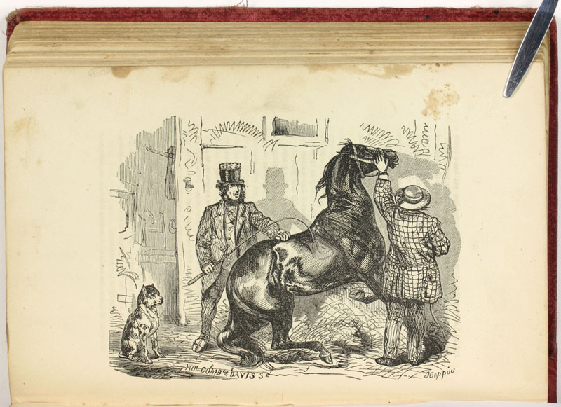Integral to the 19th-century industrialized city, horses pulled vehicles carrying everything from people to produce. By the end of the century, there were nearly 400 horses per square mile in cities in the Northeast, and over 540 in the Midwest. The market for these costly animals invited misrepresentation (like used car sales today). The author of The Spider and the Fly observes that “there cannot be conceived a race of more arrant cheats and swindlers than the whole set of jockeys, grooms, and horse-dealers.” He details the many ways people could be cheated when buying and selling horses. Shown here, a formerly sound horse has been lamed after purchase so that the remorseful buyer can return him.