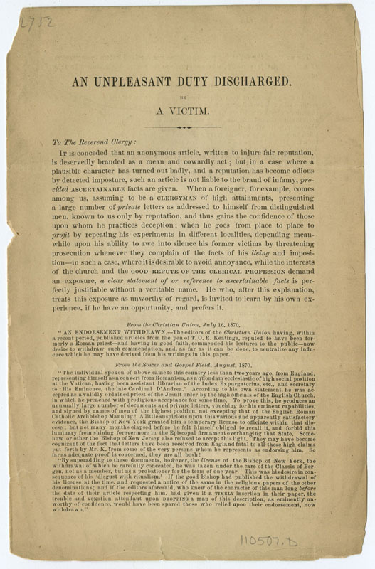 As immigrants and country dwellers crowded 19th-century cities and settled the West, people lost the intimate, face-to-face interactions that characterized much of American society during the Colonial and early Republic eras. That people were more frequently living among strangers made accurately judging others increasingly difficult. Imposters abounded. This pamphlet recounts the “operations” of one T. O. R. Keatinge, who, claiming to be a clergyman, was able to gain the confidence of victims who would loan him money for supposed necessities which he instead spent on high living and never repaid. So convincing, Keatinge gained the endorsement of Henry Ward Beecher, who published his writings in the Christian Union.